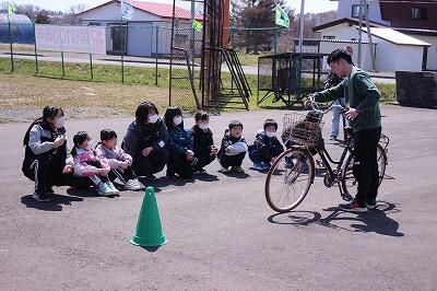 交通事故を起こさないために、自転車の安全な乗り方、道路の渡り方を学びました。枝幸警察署や役場総務課、乙忠部の駐在さんにも来ていただき、事故に遭わないための注意点を教えていただきました。