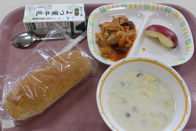 今日のメニューは、ごまパン、白菜のクリーム煮、ポークビーンズ、りんご。