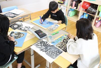 4年生は、版画づくり。表現技法を工夫しながら、丁寧に掘り進めていました。