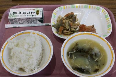 今日のメニューは、ごはん、みそ汁(玉ねぎ、わかめ)、鶏の香味焼き、歌登山菜煮。