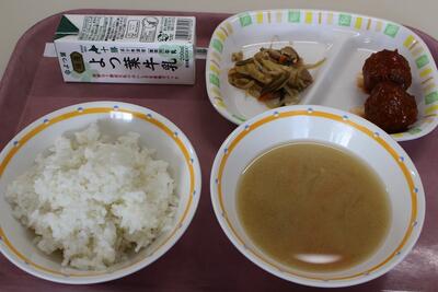 今日のメニューは、ごはん、みそ汁、ケチャップ肉団子、茎わかめのごましょうゆ炒め。