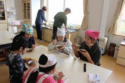 今日のメニューは、ごはん、いも団子汁、豆腐チャンプルー、ピリ辛きゅうり。